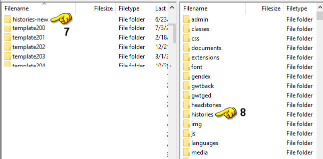 7. Navigate to your histories-new file (or wherever you placed your new history page) and then open it by double clicking on the folder to see the files.